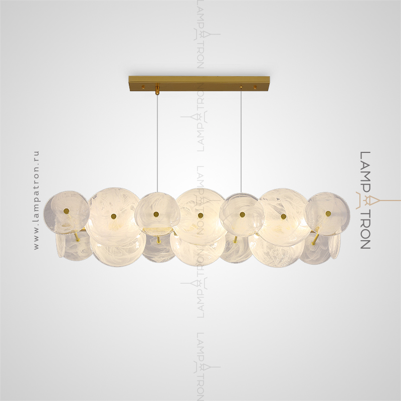 Rack lamp on a string suspension with disk -shaped glass dispersers with a smoky effect