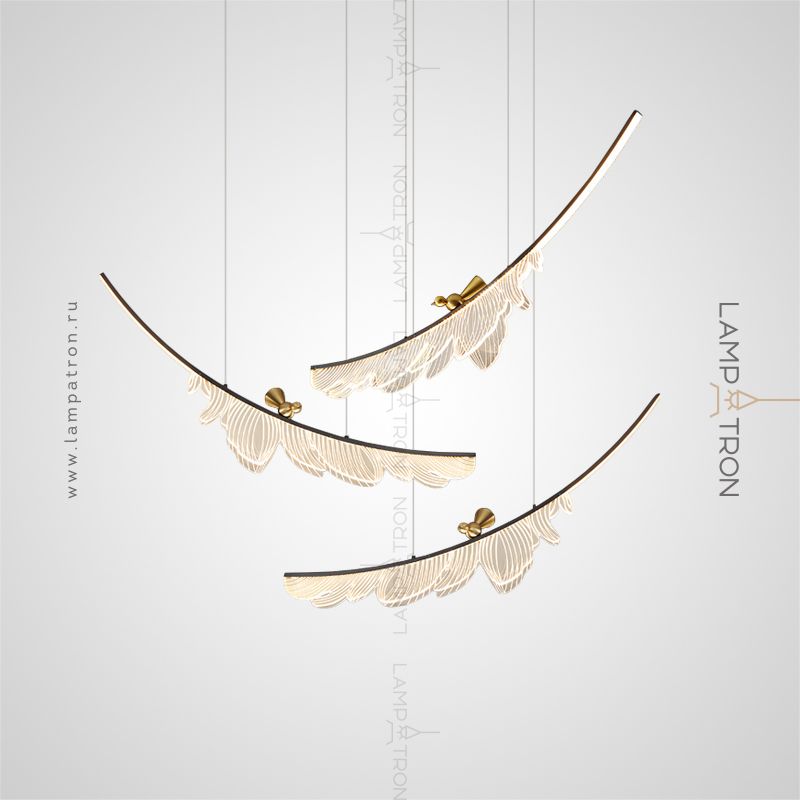 The finished combination of suspended LED lamps with leaf -shaped plafones and decorative birds made
