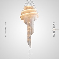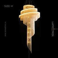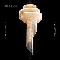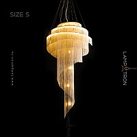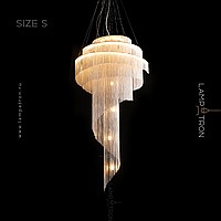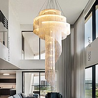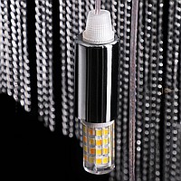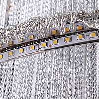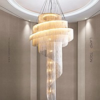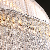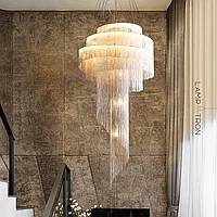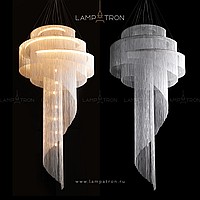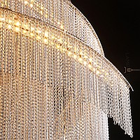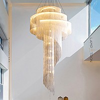 A series of chandeliers with a spiral lampshade of many chrome chains of different lengths with LED