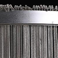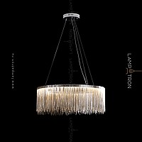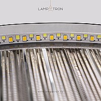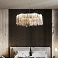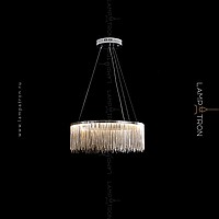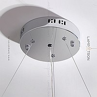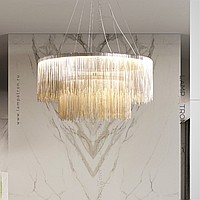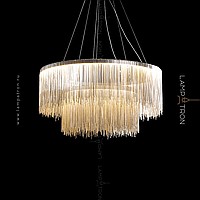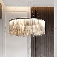 A series of LED chandeliers on a ring frame with a lampshade of many chrome chains of different lengths