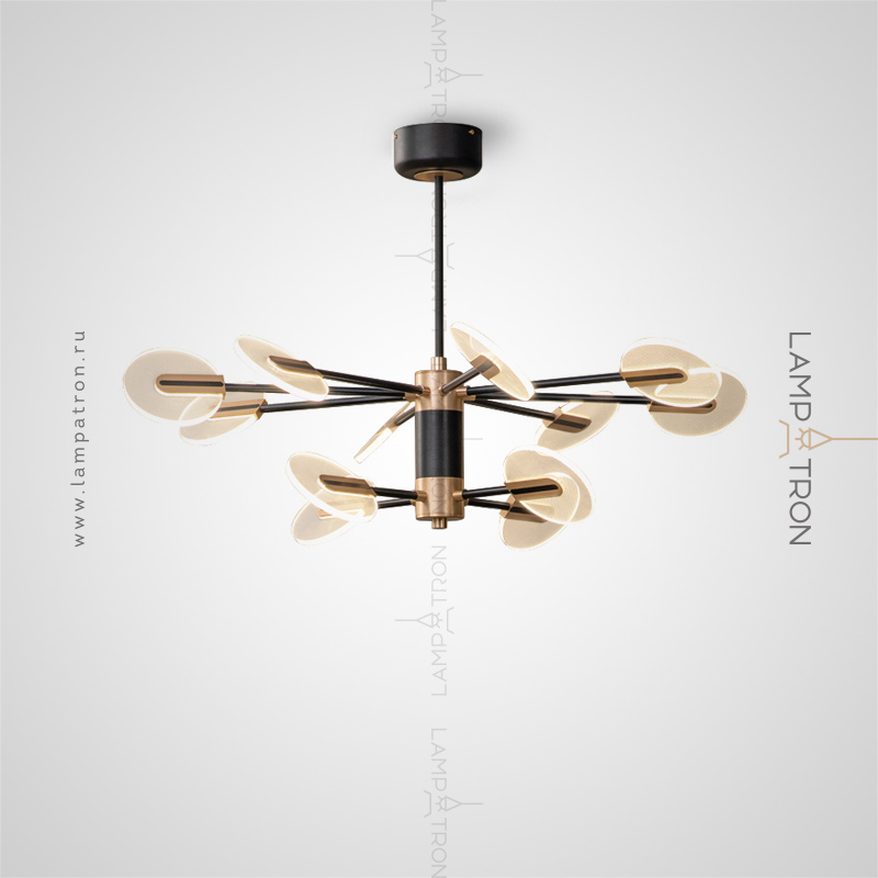 A series of LED chandeliers on a radial frame with disco -shaped swivels with a point pattern