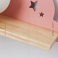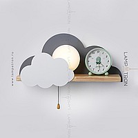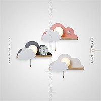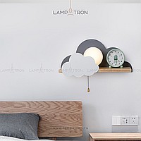 A series of wall lamps with a white spherical ceiling on a wooden shelf with decorative clouds