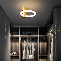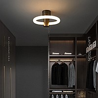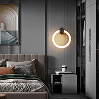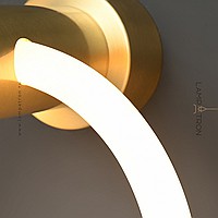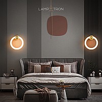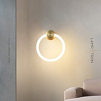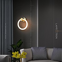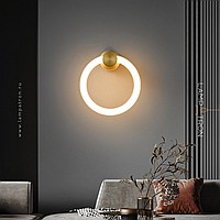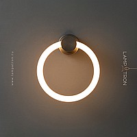 A series of LED wall lamps in the form of luminous rings on a cylindrical brass mount