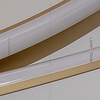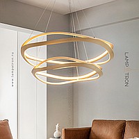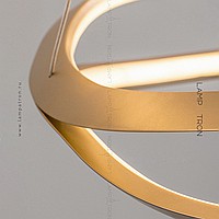 A series of designer chandeliers on a string suspension with curved ring lamps with an internal LED lighting