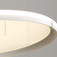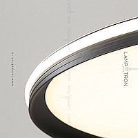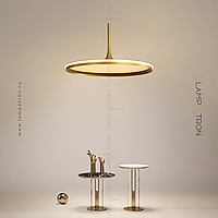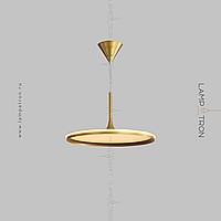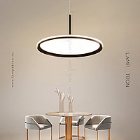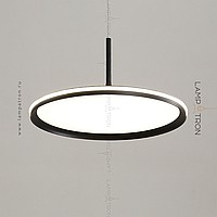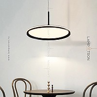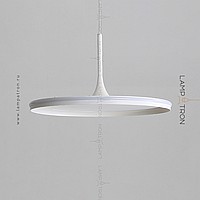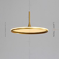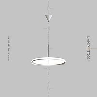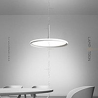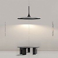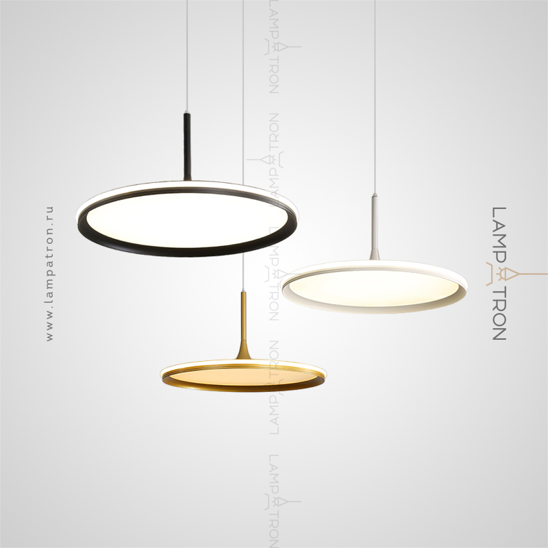 A series of suspended lamps with a disc shade LED panel and light edging along the contour of a round ceiling