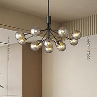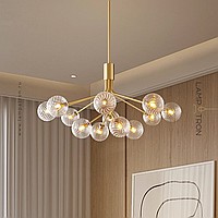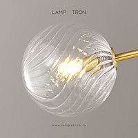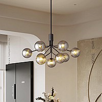 A series of chandeliers on a stand with spherical shades made of textured glass