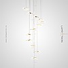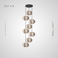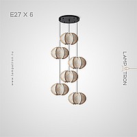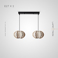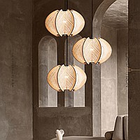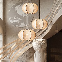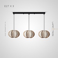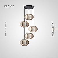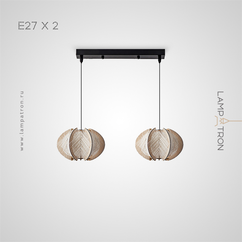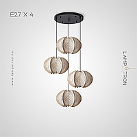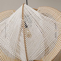 Ready-made combination of pendant lamps with thread lampshades on a light wood base