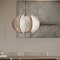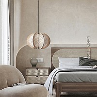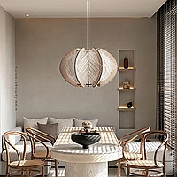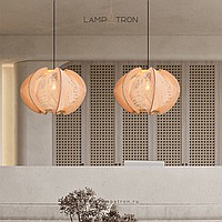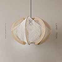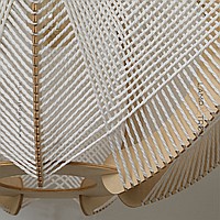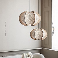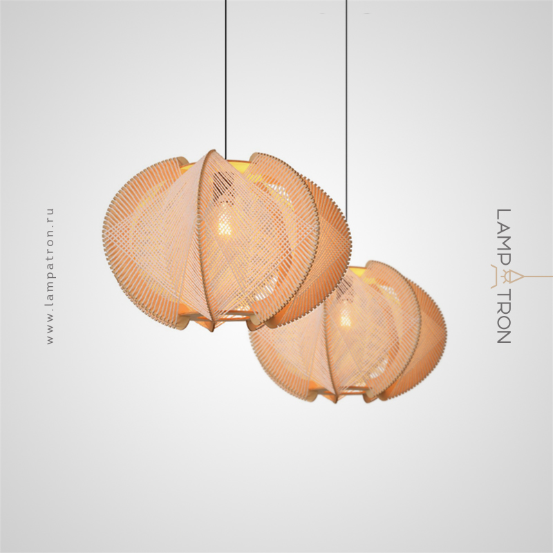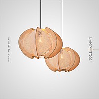 A series of pendant lamps with a thread lampshade on a light wood base