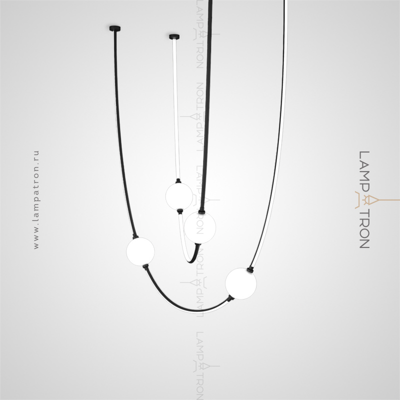 A series of suspended lamps with spherical ceiling on a tubular frame with an external and internal LED lighting