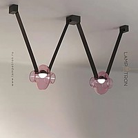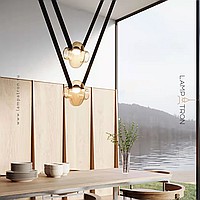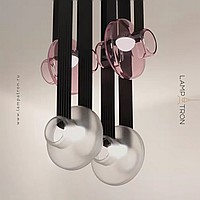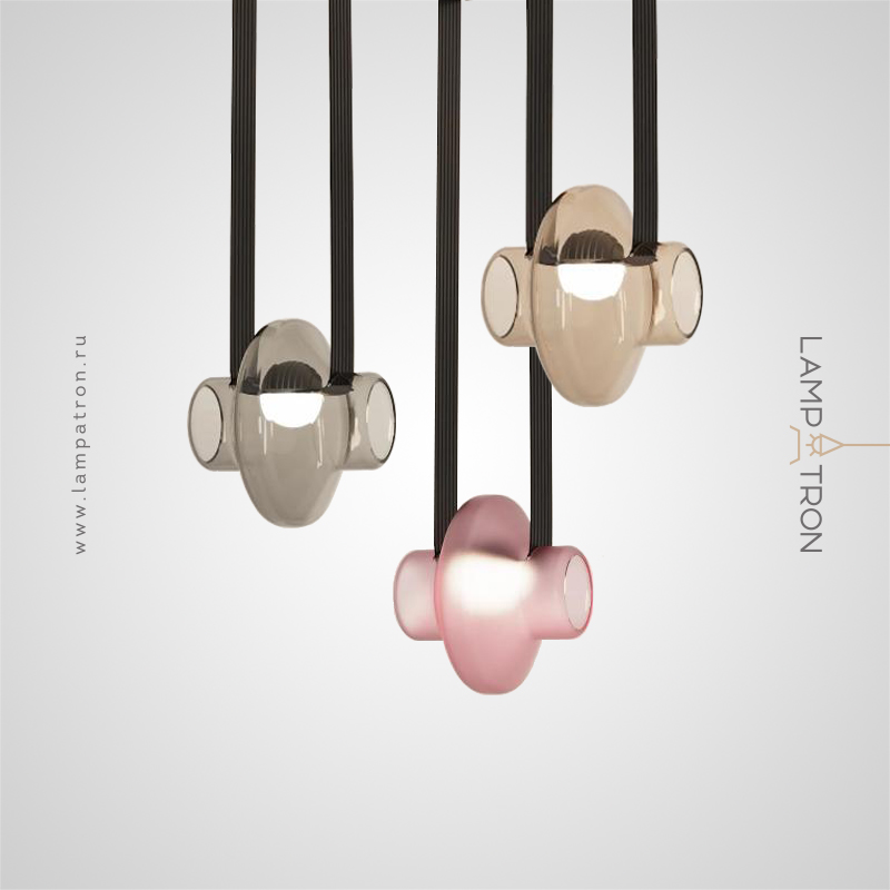 A series of pendant LED lights with a spherical body made of colored glass on leather straps