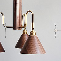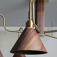 A series of chandeliers with cone-shaped swivel shades made of mahogany and ebony with brass finish