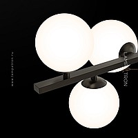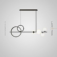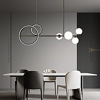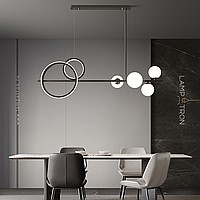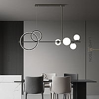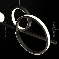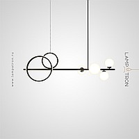 A series of slatted lamps in the form of a composition of matte spherical shades and rings with a contour LED glow