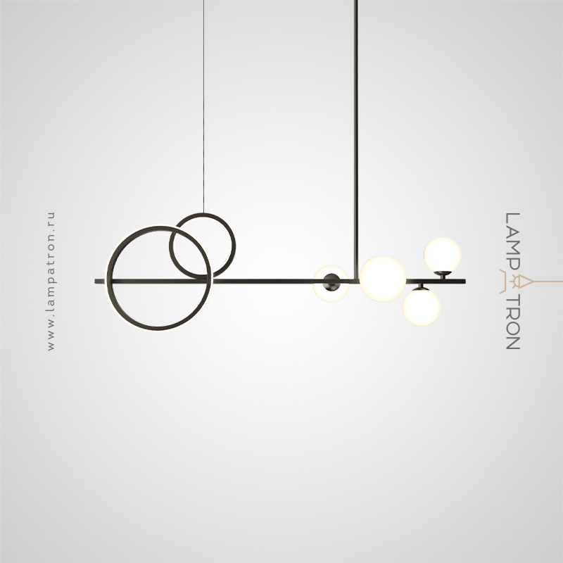 A series of slatted lamps in the form of a composition of matte spherical shades and rings with a contour LED glow