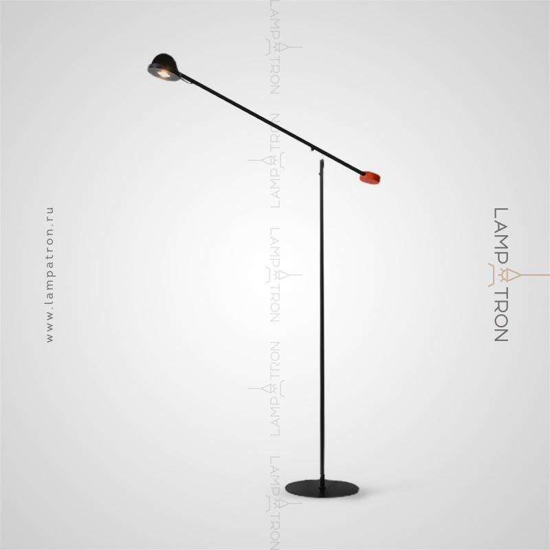 A floor lamp with a disc -shaped ceiling on a movable rod with a red tip