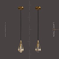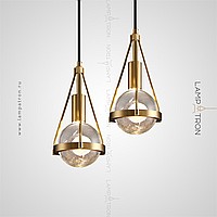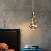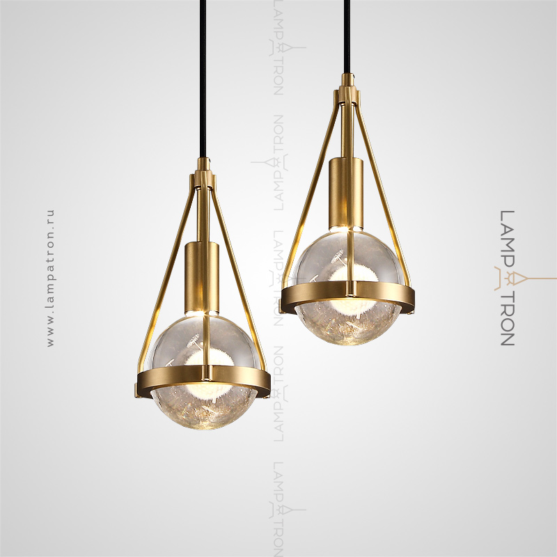 A suspension lamp with a 3D image in the form of a dandelion inside the glass sphere in a metal frame.
