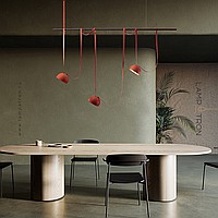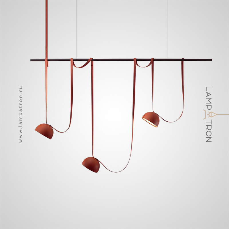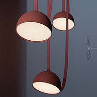 Ready-made combination of pendant LED lights with red lampshades on a black rail with textile straps