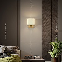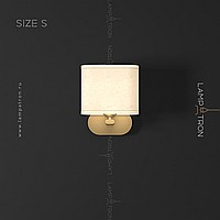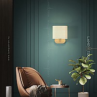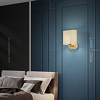 A series of wall lamps with a white textile lampshade on a rounded brass mount