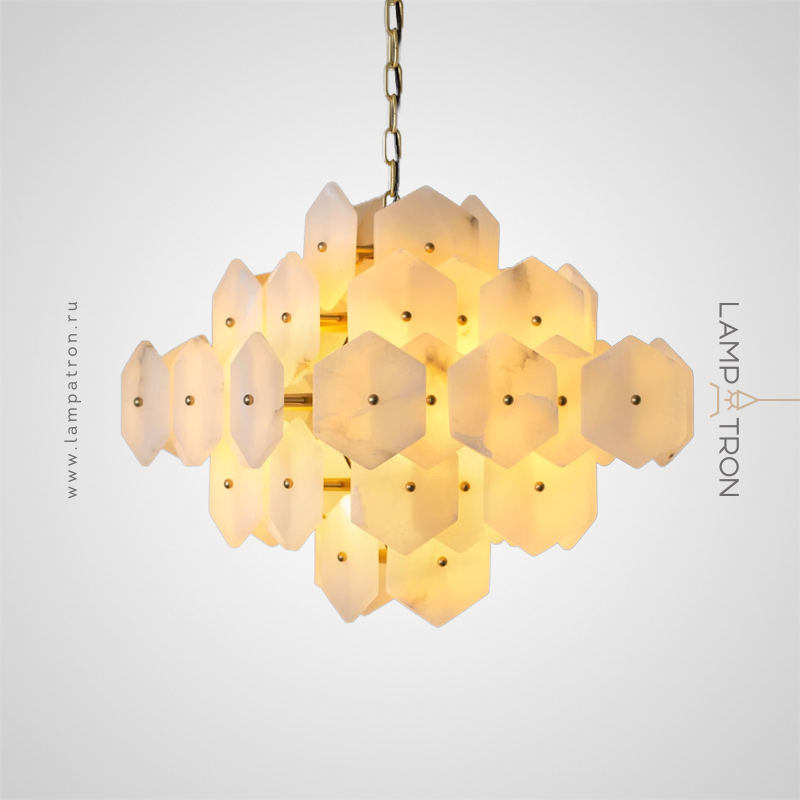 Pendant lamp of marble hexagons arranged in tiers on a brass frame