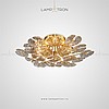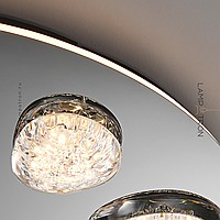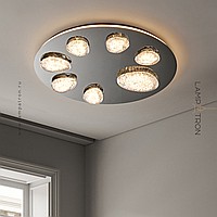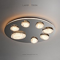 A series of ceiling LED chandeliers with almond-shaped diffusers with ice effect on a round base
