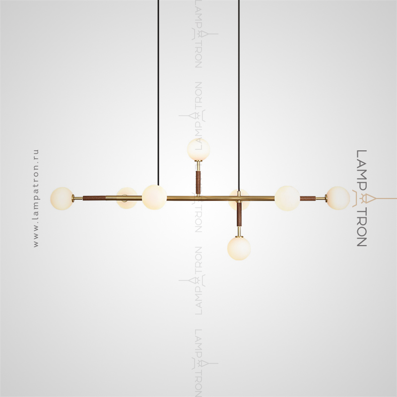 Rack lamp with spherical glass shades on multidirectional wooden horns