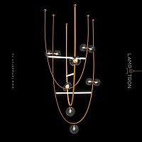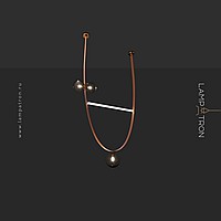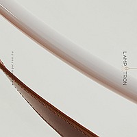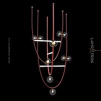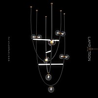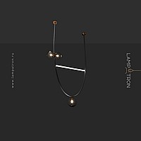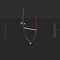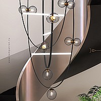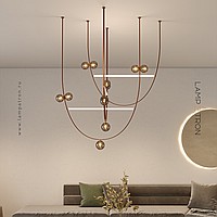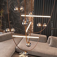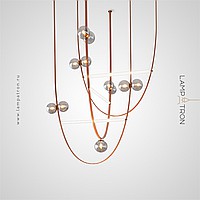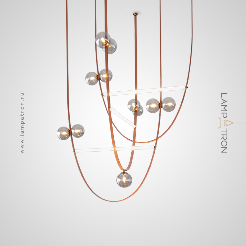 A series of luminaires with a combination of spherical and tubular light sources on hanging leather straps