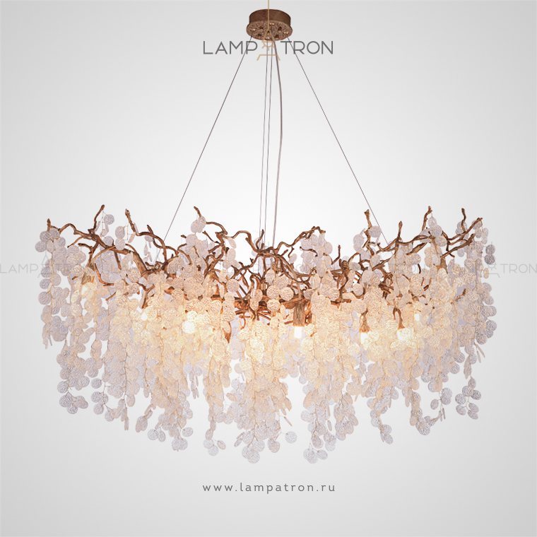 A chandelier with natural motifs on a branchy frame and type pendants made of round glass elements