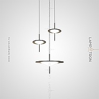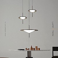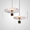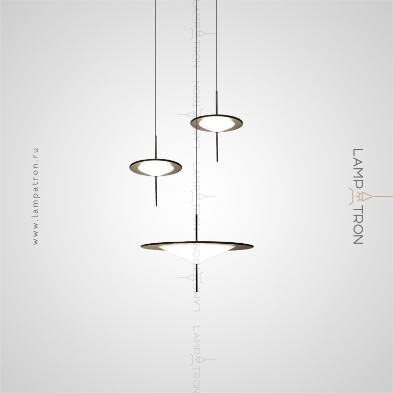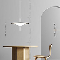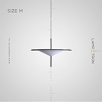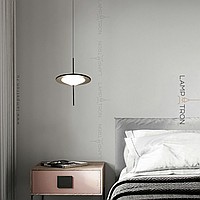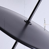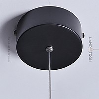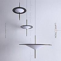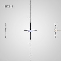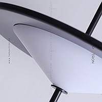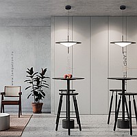 Suspended LED lamp with a white disk -shaped ceiling under a black lampshade on a thin leg