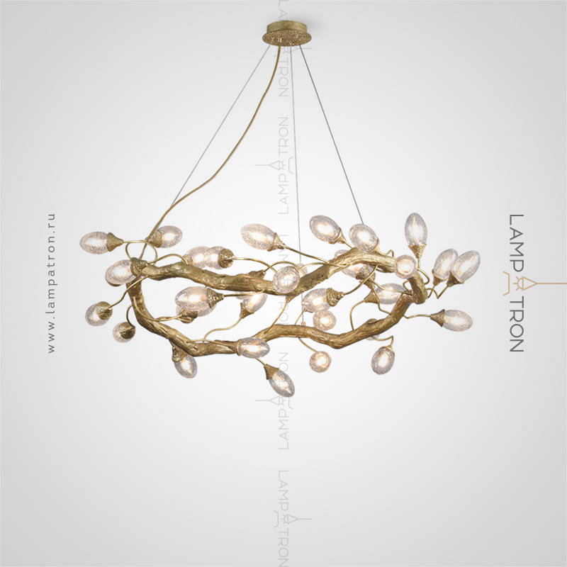 Ring chandelier with elliptic glasses of glass with the effect of air bubbles on a metal frame stylized under a tree