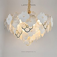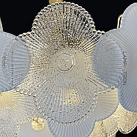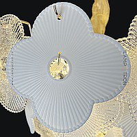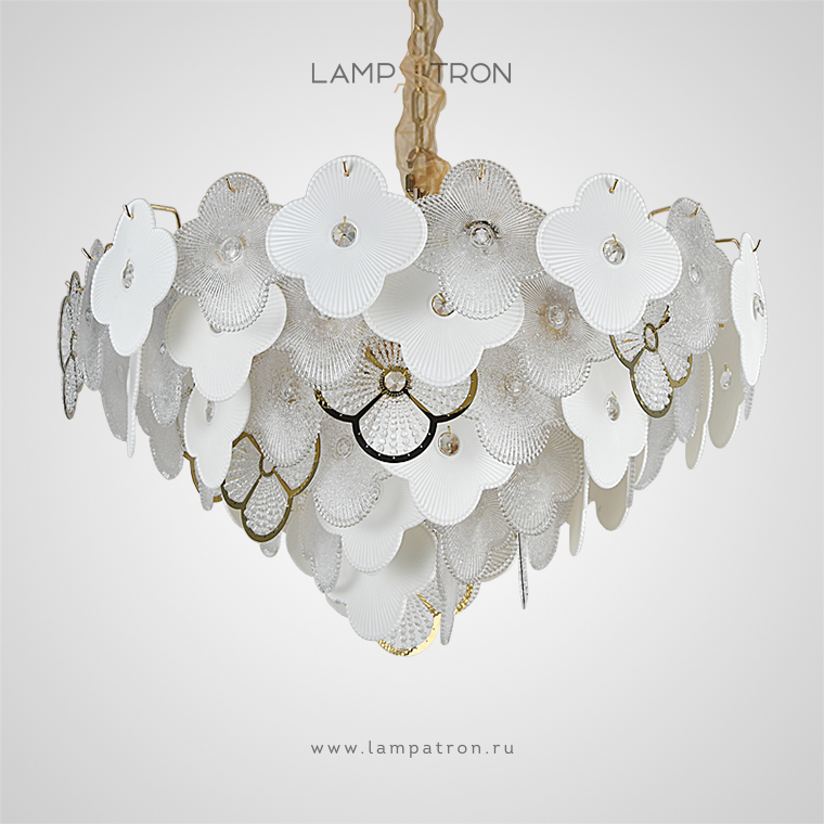 A series of chandeliers with a multi-tiered lampshade made of pendants in the form of flowers made of textured glass and crystal beads