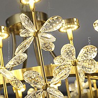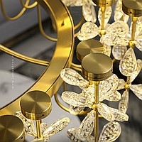 A series of ring chandeliers with LED light sources on curved horns and decorative flowers made of crystal