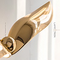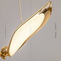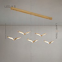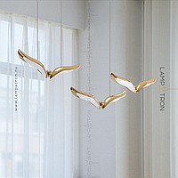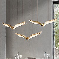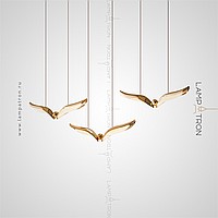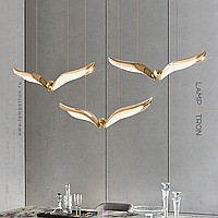 The finished combination of suspended LED lamps with curved plafones stylized under the wings of birds
