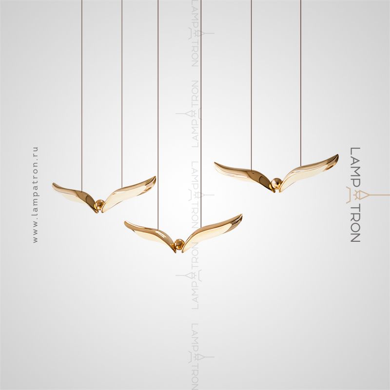 The finished combination of suspended LED lamps with curved plafones stylized under the wings of birds