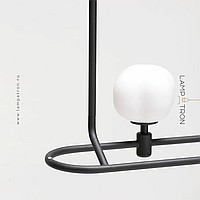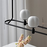 A series of rack lamps with spherical glass shades on a looped frame