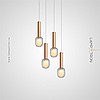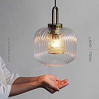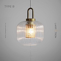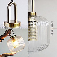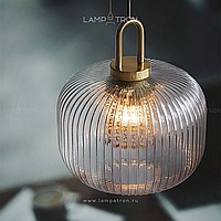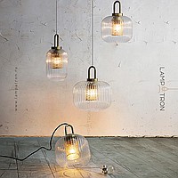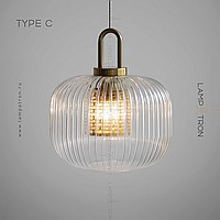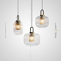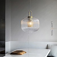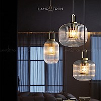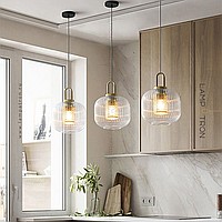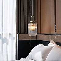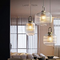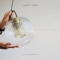 A series of suspended lamps with a lattice ceiling inside a rounded glass scatter of a rounded shape