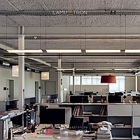 A series of rack LED lamps with elongated cylindrical ceiling and white scattering in the form of curved rectangular plates