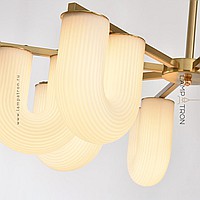 A series of LED chandeliers on a beam frame with tubular diffusers made of C-shaped glass