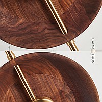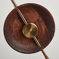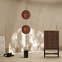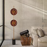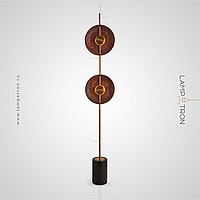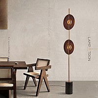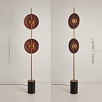 LED floor lamp with two disk -shaped walnut disperfielders on a vertical rack with a marble base