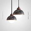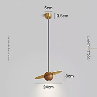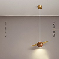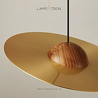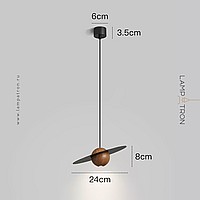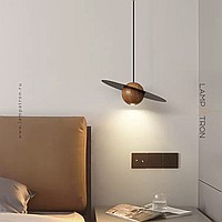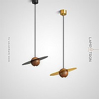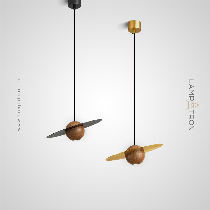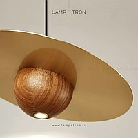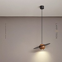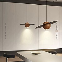 Pendant luminaire with a spherical walnut body and disc reflector with tilt adjustment