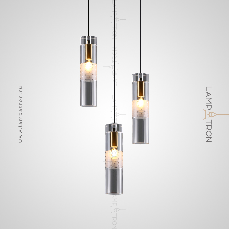 The finished combination of suspended lamps with cylindrical crystal with decorative bubble engraving of white color