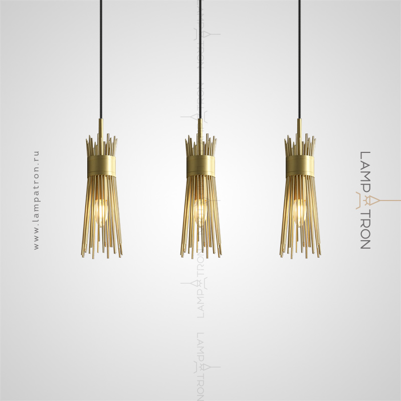Designer suspended lamp with a brass lampshade in the form of a bundle of metal rods