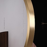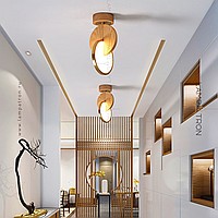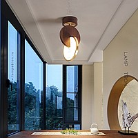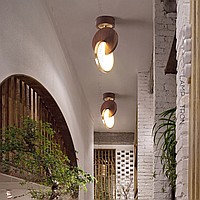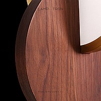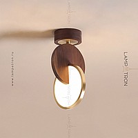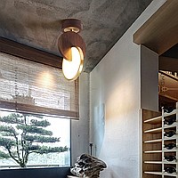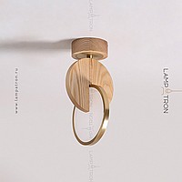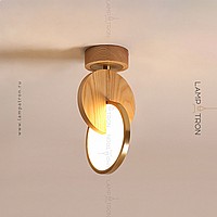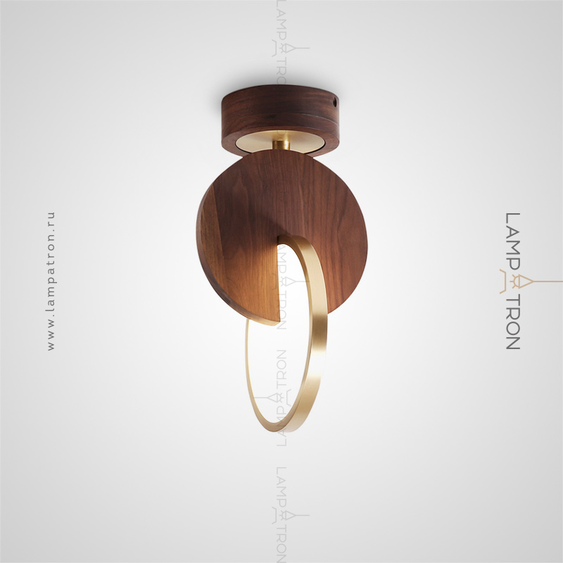 Ceiling LED lamp in the form of two intersecting discs on a wooden base
