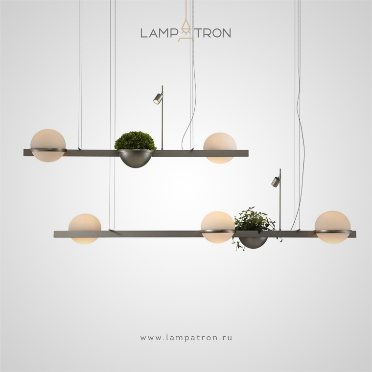 A series of LED row lamps with spherical shades and a flower pot in the shape of a hemisphere