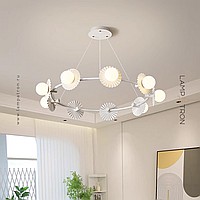 A series of ring LED chandeliers with white spherical shades on corrugated round bases