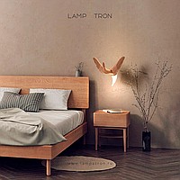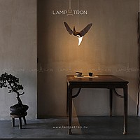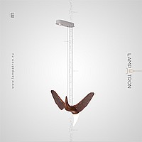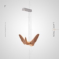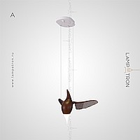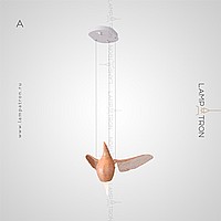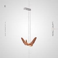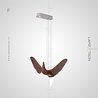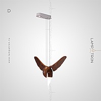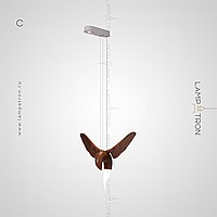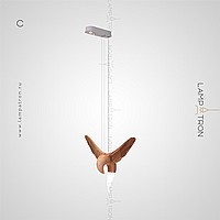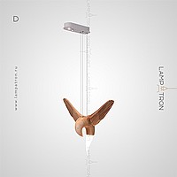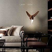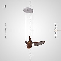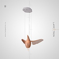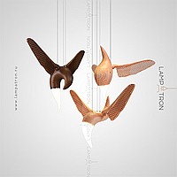 A series of suspended lamps the form of wooden birds with luminous beaks with an additional light element in the ceiling mount
