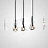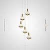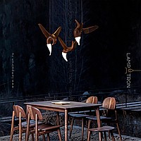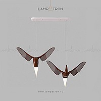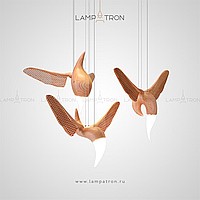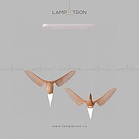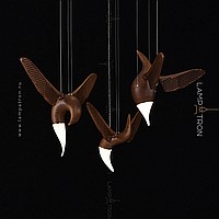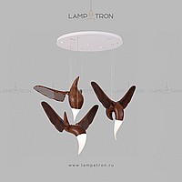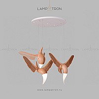A finished combination of suspended lamps of wooden birds with luminous beaks with an additional light element in the ceiling mount