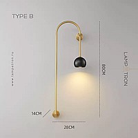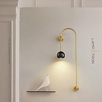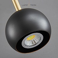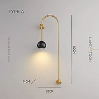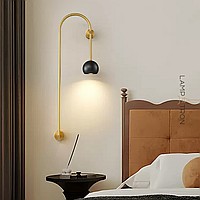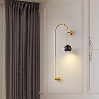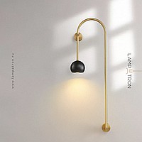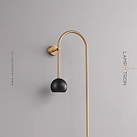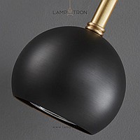 Wall lamp with black shade in the shape of a truncated ball on a curved brass post