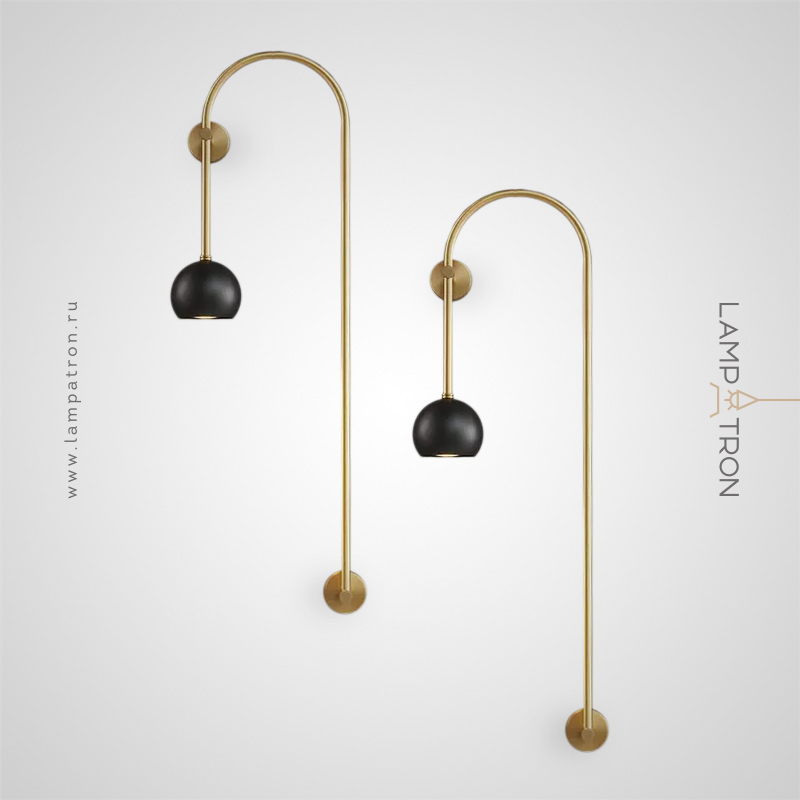 Wall lamp with black shade in the shape of a truncated ball on a curved brass post