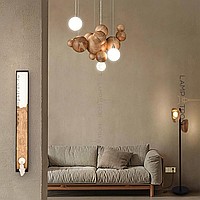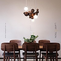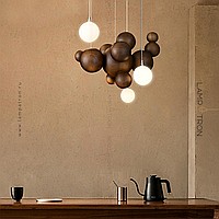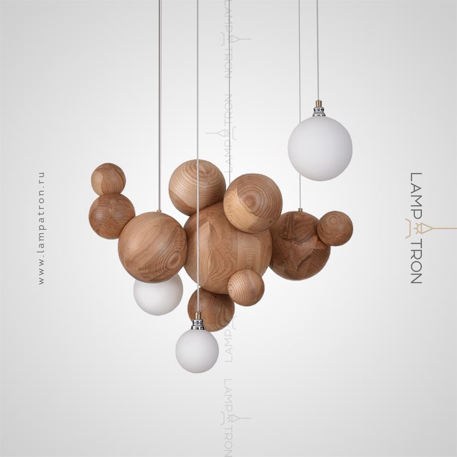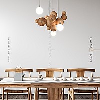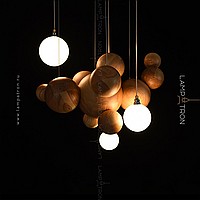 Suspended lamp in the form of a composition of wooden balls of different diameters