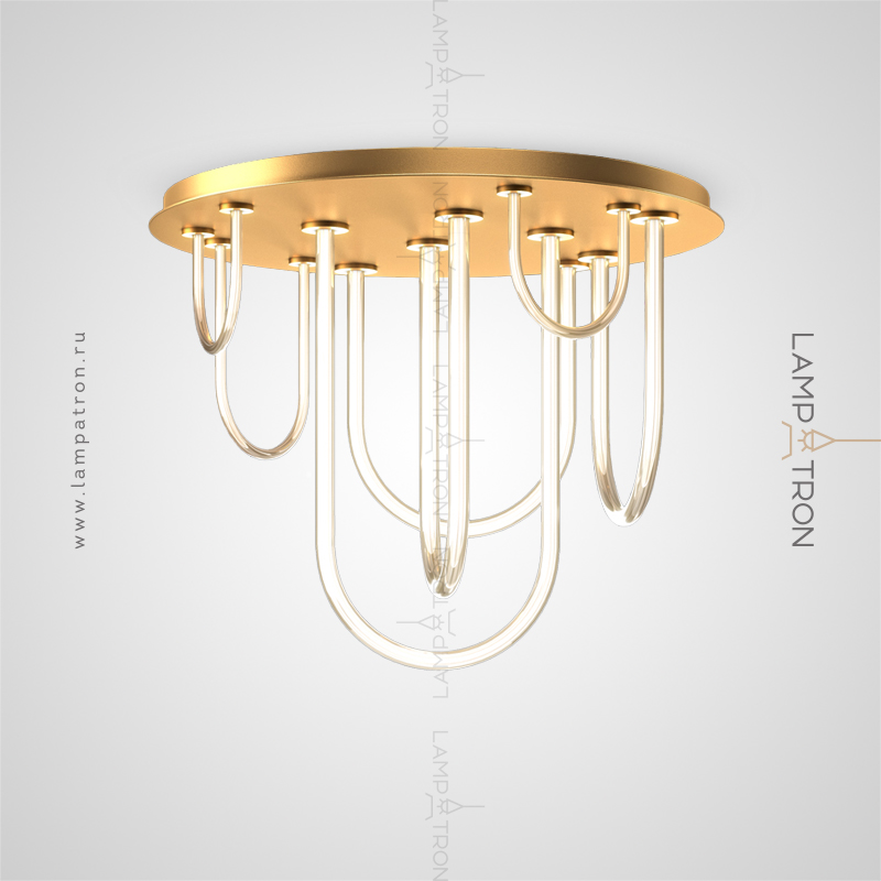 A series of ceiling LED chandeliers with tubular arceprints on a disco base