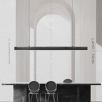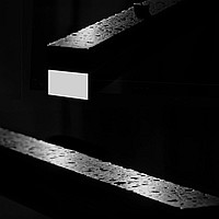 A series of LED-backlit slatted luminaires on the bottom of a rectangular black stone housing